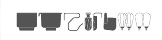 Rozsdamentes acél dagasztó tál, műanyag dagasztó edény, műanyag fedő, hagyományos dagasztó kar, csavaros dagasztó fej, spatula a géphez, kézi spatula, kétféle habverő fej.