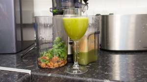 Az alma és narancs után készítettünk egy igazán remek italt, spenót levelekből és ananászból. Az ananász nem csak kellemesebb ízt ad, hanem segít a leveleket letakarítani a préshengerről. Az eredmény egy édes, zöld ital, mely semmilyen szétválást nem mutatott, még azután sem, hogy állni hagytuk.